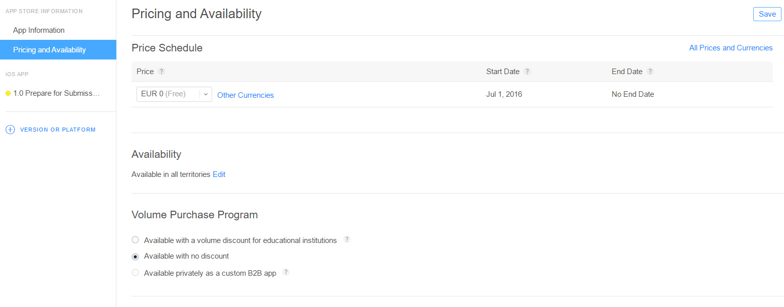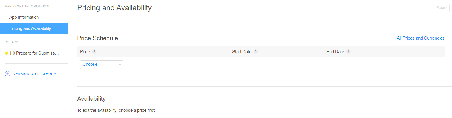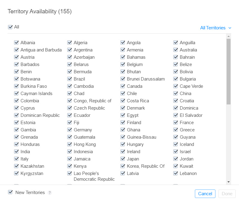 8. In Availability, by default all territories are selected, but you can select the countries where your app will be available.