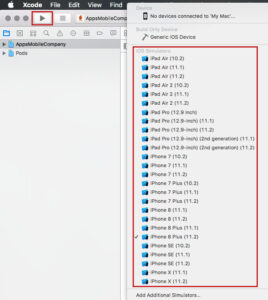 5. On top of the Xcode you can see: Appsmobilecompany and “iphone” besides it. Click on Iphone and then you see all the types of iphones. Choose “generic iOS device”