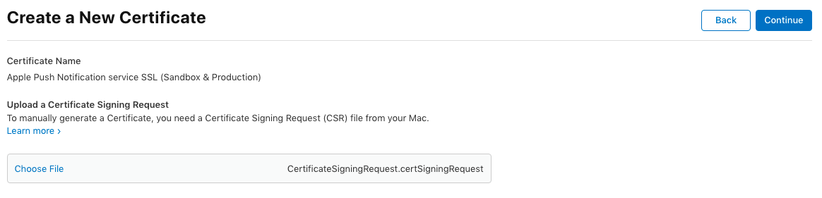 – Click on “Choose File” and upload the CSR file you have created before for this developer account (the same CSR you have used to create the iOS Distribution certificate for this developer account):