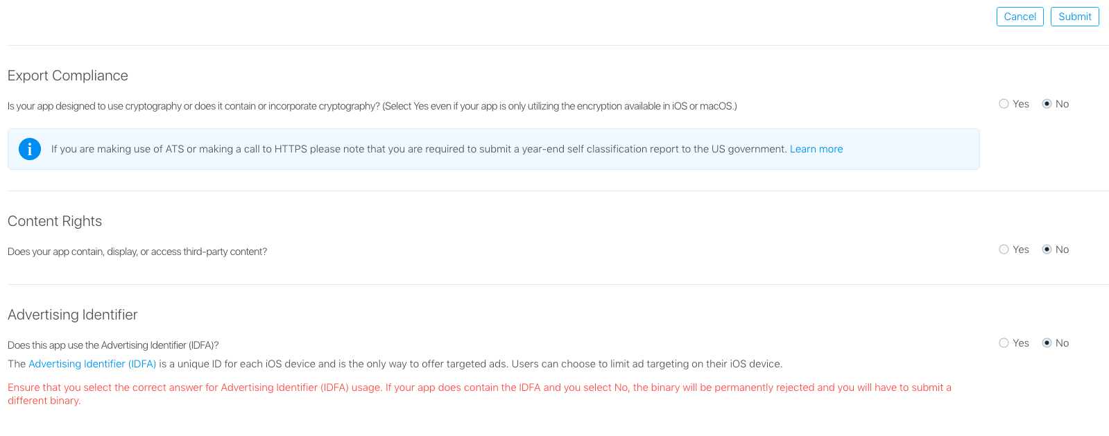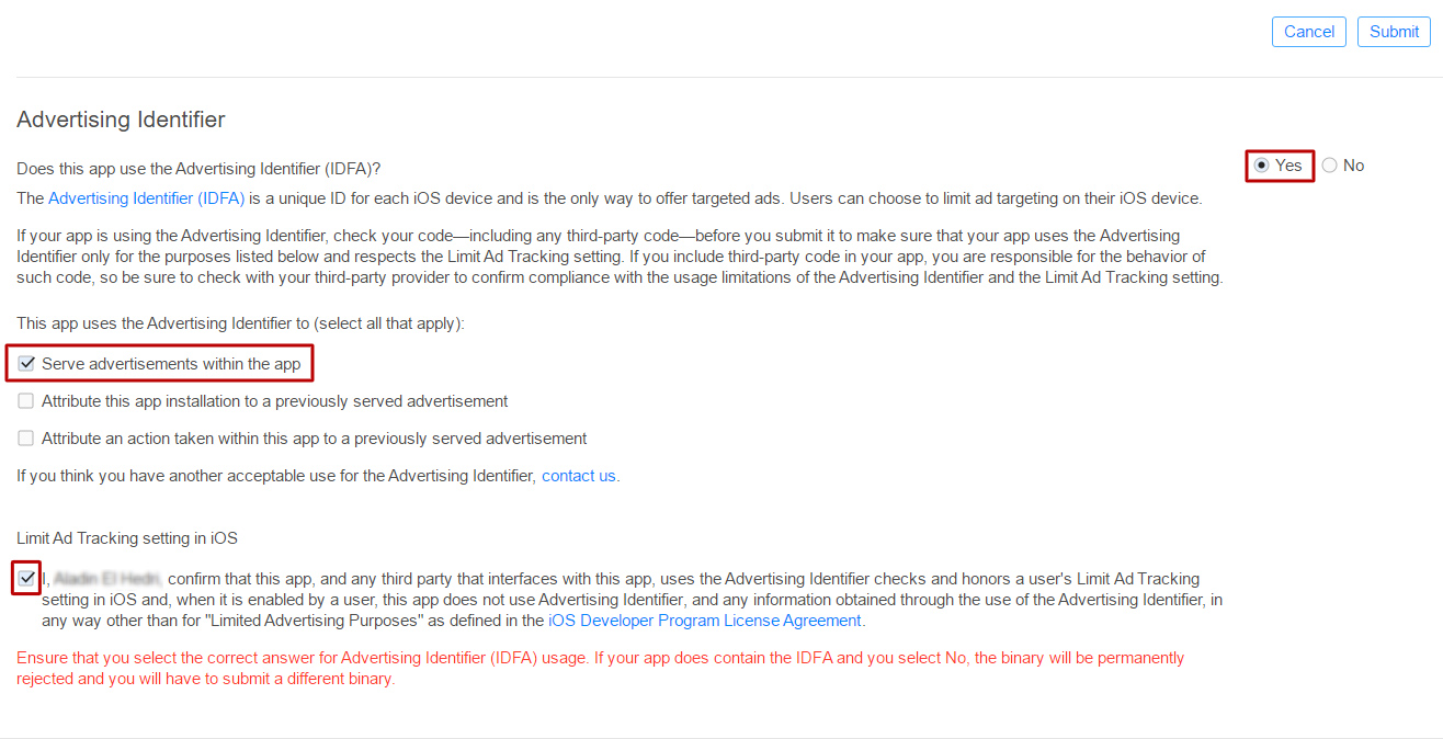 In Advertising Identifier, select No if you have not added AdMob ads and click Submit.