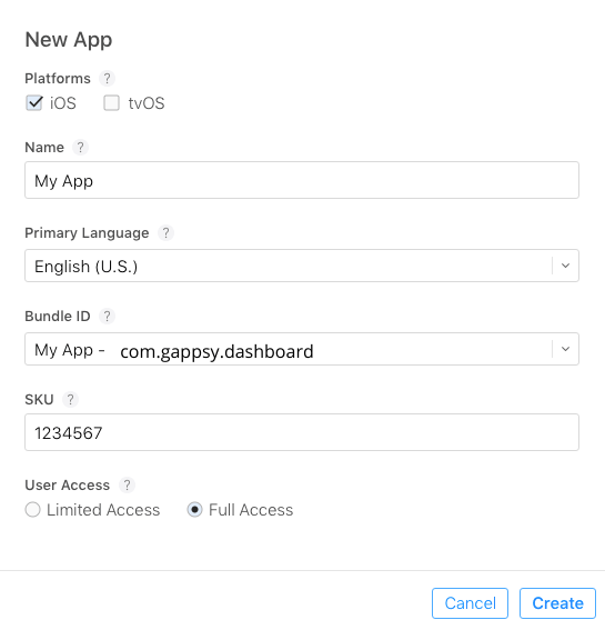 – Enter your app name, the Bundle ID of the app:
